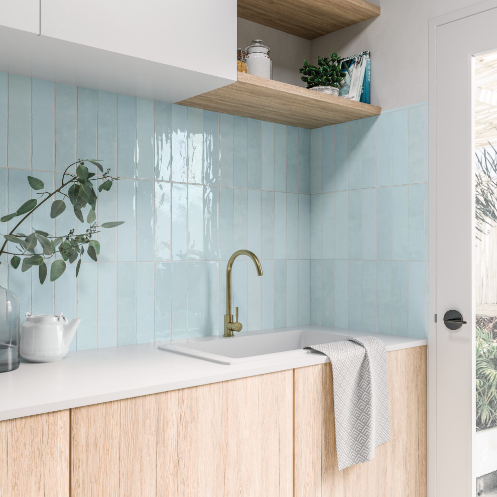 Photo from Arizona TileArizona Tile’s new Flash collection includes a 3-by-12-inch tile, shown here in Light Blue, laid...