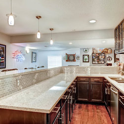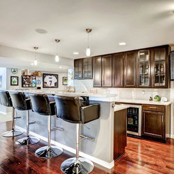 Full bar with custom cabinets, granite counter tops and stainless steal back splash.