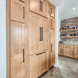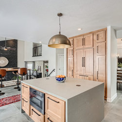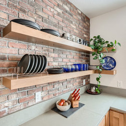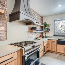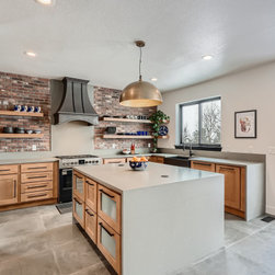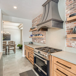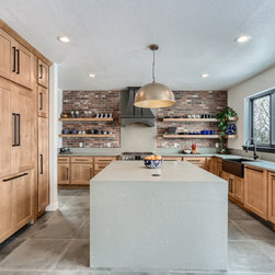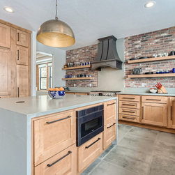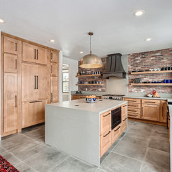 This is a fully custom kitchen featuring natural wood custom cabinets, quartz waterfall countertops, a custom built vent hood, brick backsplash, build-in fridge and open shelving. This beautiful space was created for a master chef with mid-century modern a touch of rustic aesthetic.