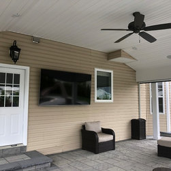 Robbinsville, NJ Backyard design with attached covered roof.