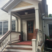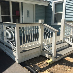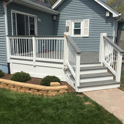Small deck with Trex Transcend Island Mist decking, cedar and aluminum railings, and a tongue and groove paneled cedar skirt.