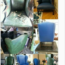 Wingchair with potential that needed some TLC - The Green turned into a beautiful Nautical Blue Leather along with Pewter Nailheads all around.