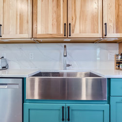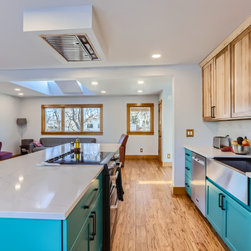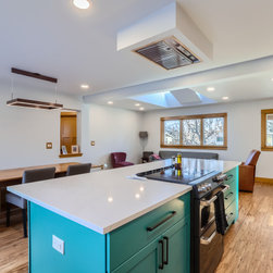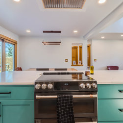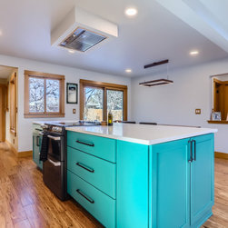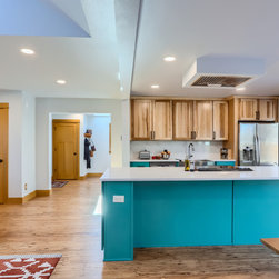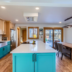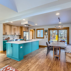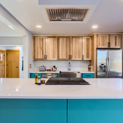 This kitchen makes a confident statement with its vibrant teal base cabinets and island, balanced beautifully by the warmth of natural hickory uppers. The combination of clean, vertical wood grain and saturated color brings an organic-meets-modern energy to the space.