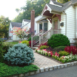 Along with the new portico, new railings for the steps and a lamppost were installed, as well as a new belgian block lined asphalt driveway. The landscape was designed with mostly evergreen shrubs. Annuals are changed out for additional seasonal color.