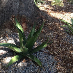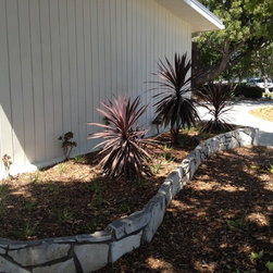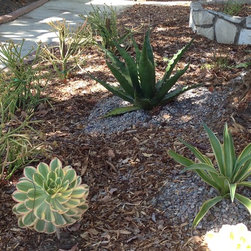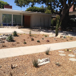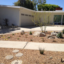 Mid-Century Modern renovation. All lawn removed and updated with succulent, and 'Water-wise' plants. Traditional emitters for grass retrofitted with in-line emitters below top dressing. Groundcovers include gravel, composted mulch and sedums.