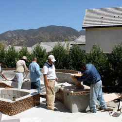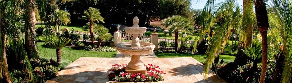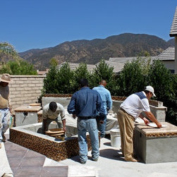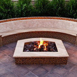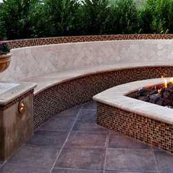 Bruno and his team created this beautiful outdoor seating area with fire pit that successfully blends the Spanish style elements of the home with the clients love for contemporary. The trees add texture, color and desired privacy screen