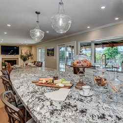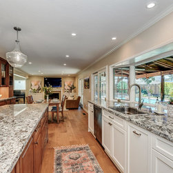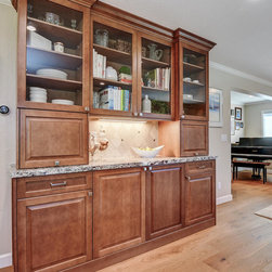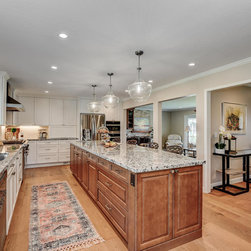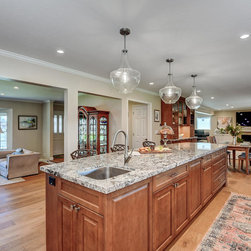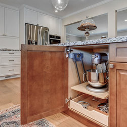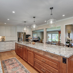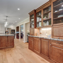 A new island serves as a buffet when entertaining. The bright color of the base cabinets and warm granite top shine against the massive island, stained in a delightful chocolate brown, serves as the focal point of the kitchen work area.
