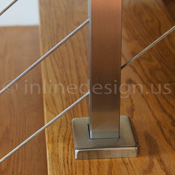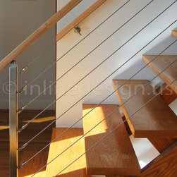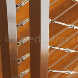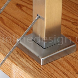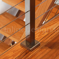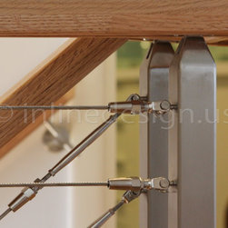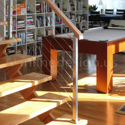 The rectangular choice of wooden handrail mimics the stair treads with clean lines up to the landing, and the railing makes a sharp u-turn where the upper stair post and landing end post with swageless terminals break up the different spans of cable.