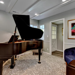By removing the walls this allowed us to put the dining room in the new addition area. The kitchen space was then reconfigured in the existing location. The client also wanted to highlight the music room, and have the option to close off the space when needed, so a barn door was installed between the music room and the great room for this purpose. The barn door added an appealing touch to the remodeled areas.