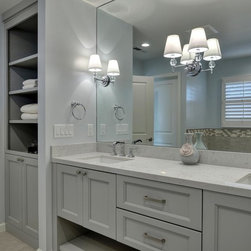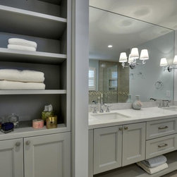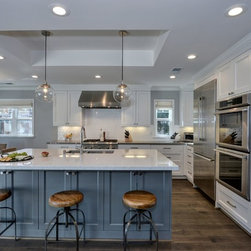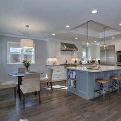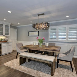 A sleek, modern fireplace adds an element of warmth to the space, both literally and figuratively. It serves as a gathering point, drawing people together with its inviting glow. The choice of the contrasting grey island against the white perimeter cabinets was not merely a stylistic one; it’s a deliberate decision to create a focal point that is both comforting and striking. Silver and glass dining room elements serve as complementary accents, and classic wainscotting add a touch of timeless comfort.
