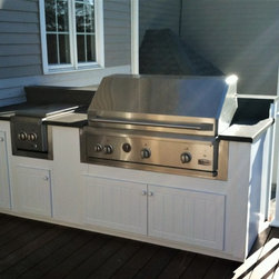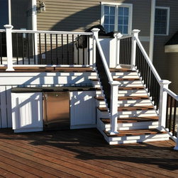Cooking station with custom built cabinets on the top level of the multi-tier deck