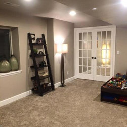 Basement Rec Space/Playroom with beautiful french doors to a workout area
