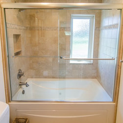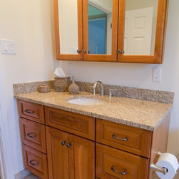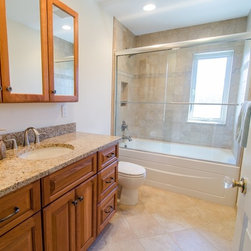 This bathroom was totally remodeled from top to bottom. A small bump out to the left of the original tub was eliminated to make room for a 36"x 66" oversized soaking tub. Custom natural cherry cabinetry was installed, and included a customer triple medicine cabinet. The tile tub surround included trimming out the existing window in tile and a matching granite sill.