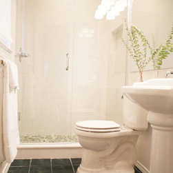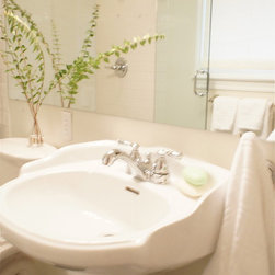 This is a tiny bathroom, only 4"x10" in size. The owners wanted to keep the floor tile (heated), but the rest was completely updated. In order to give this tiny bathroom an illusion of space, we installed a large mirror which covered almost the entire wall. White and off-white colors create...