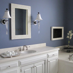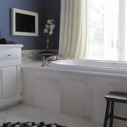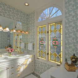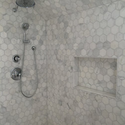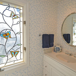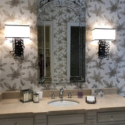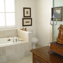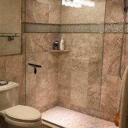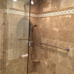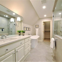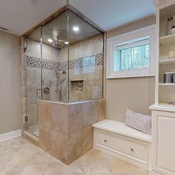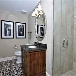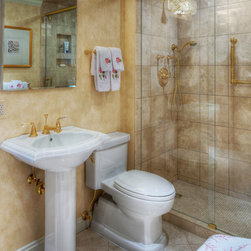 Welcome to this warm and charming guest bathroom. The steam shower features a rain shower head, builtin seat, and open glass enclosure. The custom built cabinetry houses all the necessities one would need for guests while still allowing for beauty. The porcelain floor is easy to maintain and offers...