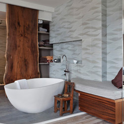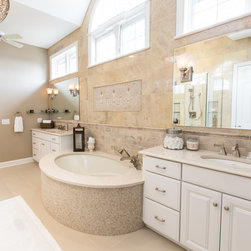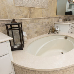 Beautiful stone by Jeffrey Court used in this Des Moines bathroom. Created by Woodharbor Kitchen & Bath.