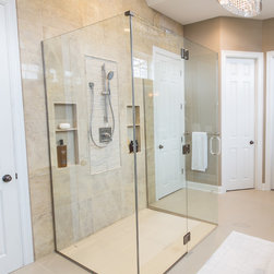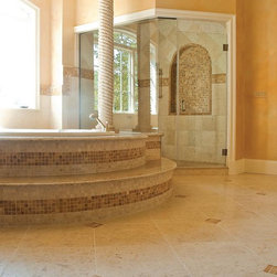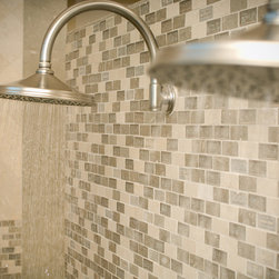 Luxury shower space designed by Woodharbor Kitchen and Bath using Jeffrey Court stone.
