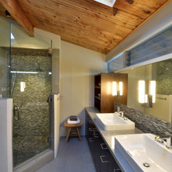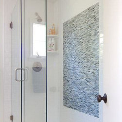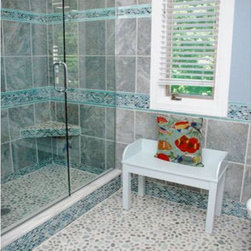 Blue-green slate with white subway tile for shower walls and blue-green glass mosaic for shower niche, pebble shower pan