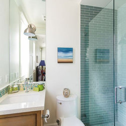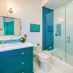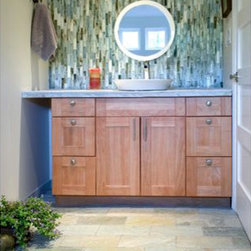 blue glass subway tile for shower walls with blue-green glass mosaic in soap niche and on vanity back splash, white quartz counter tip with light wood cabinets