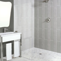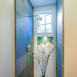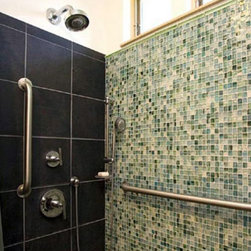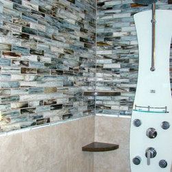 blue-green glass mosaic accent shower wall with grey field tile.