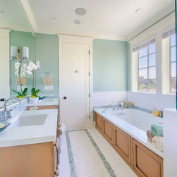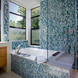 blue-green glass mosaic accent tub-shower wall