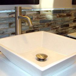 glass brick mosaic back splash with glass bar liner and vessel sink