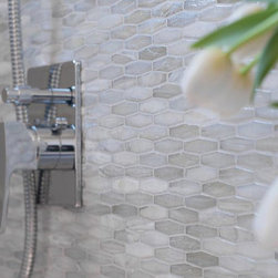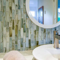 Lunada Bay Tozen Martini Argon Silk glass mosaic tile for vanity backsplash and shower wall. Pebble shower pan