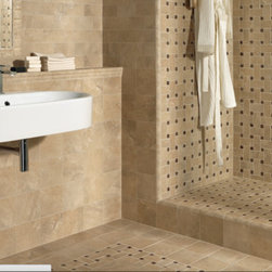 1x4 glass mosaic tile with travertine tile for shower walls and glass bar liner