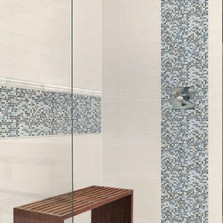 blue mosaic accent tile with blue glass bar liner on shower wall as accent and grey chiseled edge tile for shower wall field tile