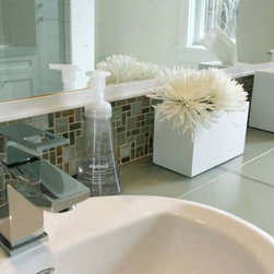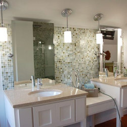 green glass mosaic vanity wall with quartz counter top and white cabinets