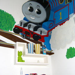 Thomas the Train emerges from the corner of this Toddlers Bathroom.
