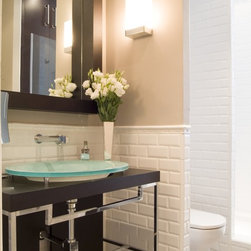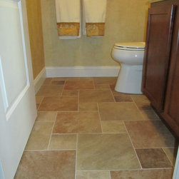 Shaded porcelain tiles installed in a hopscotch pattern give this Powder Room a warm look and easy care.