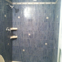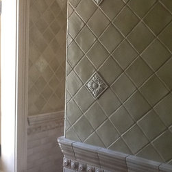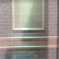 Adex Ocean Topsail crackle 3x9 Subway tile with 6x6 Caspian insert and liners.
