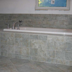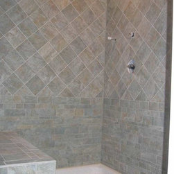 Slate look porcelain tiles in several shapes and patterns create a serene, spa like look.