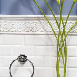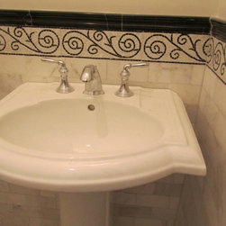 Carrara marble subway tile with a beautiful scroll border topped with a Nero Marquina chair rail.