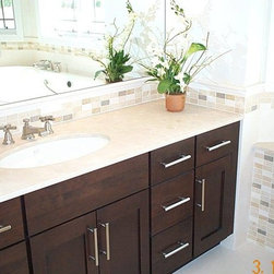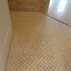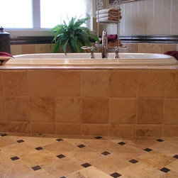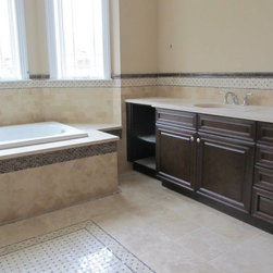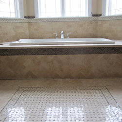 This luxurious Master Bathroom Suite combines the casual ease of honed limestone with the elegance of polished Crema Marfil and Dark Emperador. The stones are used indifferent sizes and patterns, the basket-weave inlay and borders tie the room together.