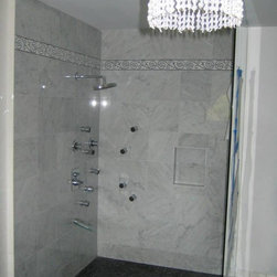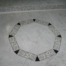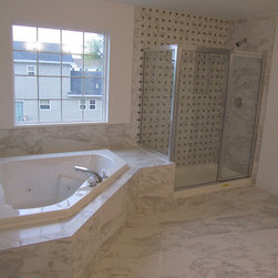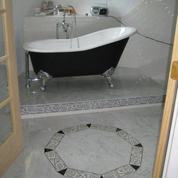 Polished Carrara marble with traditional accent pieces and custom medallion create a one of a kind oasis for this master bath.