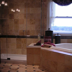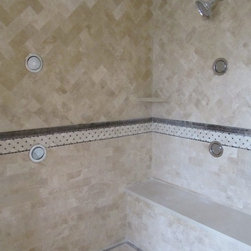 Honed Limestone is accented by Bronze metallic inserts in this master bathroom suite.