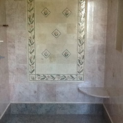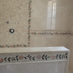 Polished pink marble with tulip borders and inserts coordinate with the matching green marble, from the border, for the floor and shower pan.