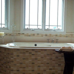 Honed Limestone in multi -colors and shapes create a spa like atmosphere in this master bathroom suite.
