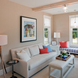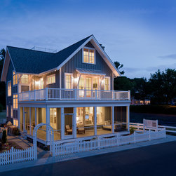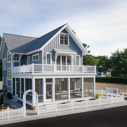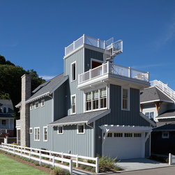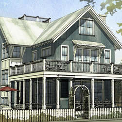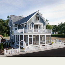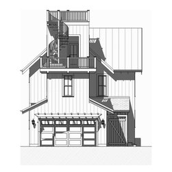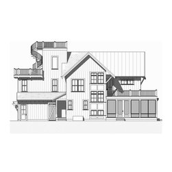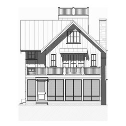 This neighborhood cottage plan is focused on outdoor living. With a front covered screen porch, upper sun deck, entertaining balcony complete with bar, and viewing tower you will not miss a view. The open main floor with family, dining, and kitchen flow great for entertaining. A large foyer and mud room off the side entry and garage provide ample storage. The second floor stair hall has access to the sun deck, as does the private master suite. An additional guest suite and family living or game room occupy this floor. The third floor provides another guest suite as well as bunk rooms for the kids. An entertaining balcony with bar and viewing tower is the perfect spot for a drink and sunset gathering.
