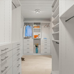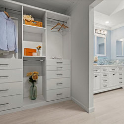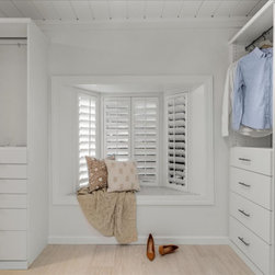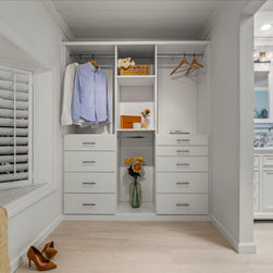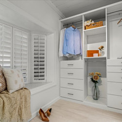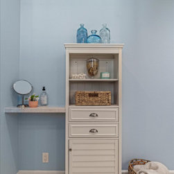 On your left upon entering is the spacious walk-in closet, complete with adjustable shelves and cozy window bench. Polished chrome grab bars are strategically placed throughout the bathroom, an ADA height compliant toilet and custom height linen cabinet made mobility accessibility a key component for this project, yet no beauty was sacrificed to make this happen. This bathroom and closet are now the perfect pairing of both our clients’ desires in one charming sea blown setting.