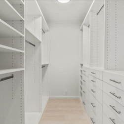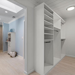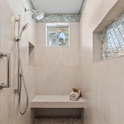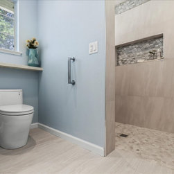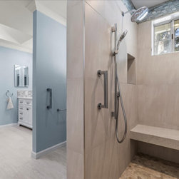 Designing an ADA bathroom requires thoughtful consideration, and every element of the shower and walk-in closet had to be well discussed, thoroughly planned, and constructed to meet unique needs. Leveling throughout was paramount to allow independent rotation of a walker and wheelchair, widening the entry to the now curbless shower provides a safe and seamless transition from the open bathroom to the enlarged shower. Non-slip pebbled tile, an adjustable handheld shower head, and two reachable convenient niches sit above the proud floating shower bench creating a zero-barrier universal space.