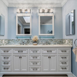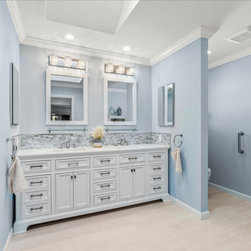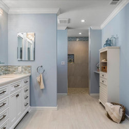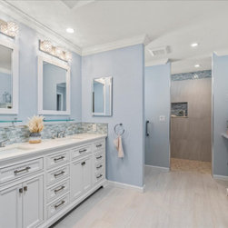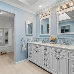 The essence of the seashore is felt the moment you enter, with tranquil sky-blue cascading walls, accent mosaic Tommy Bahama tile adds depth and contrast along the vanity and shower. Creating the visual of changing tides, with natural white tiles combined, creates the illusion of sand and sea. The beautiful new whitecap vanity pairs perfectly, with its double sink and its plethora of storage. No longer does this bathroom feel dark and damp, instead it is almost as if an ocean breeze crests against your face.