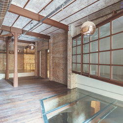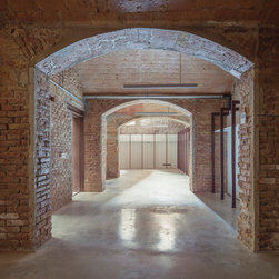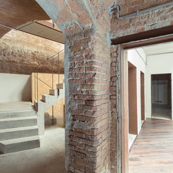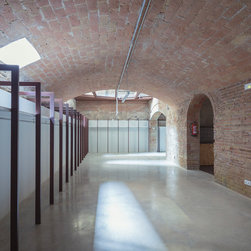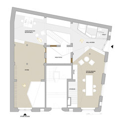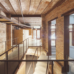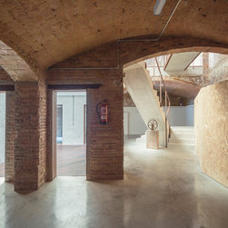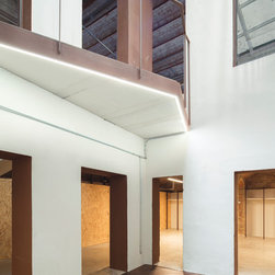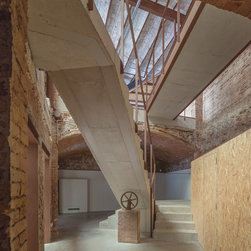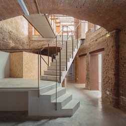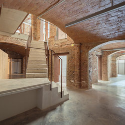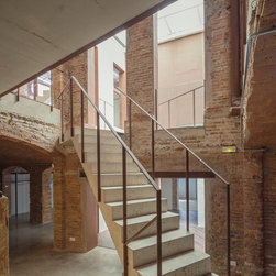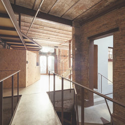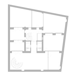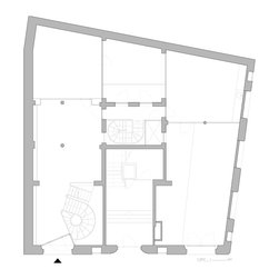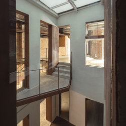 El nuevo esquema de funcionamiento modifica la posición de las escaleras existentes proponiendo un nuevo núcleo de comunicaciones verticales centrado en la parte posterior del patio. Se ha simplificado la conexión entre plantas con la construcción de una única escalera de hormigón en un hueco obtenido mediante el corte de un cuadrante de bóveda. El hueco de la antigua escalera principal se ha cubierto con vidrio transitable convirtiéndolo en un lucernario que facilita la entrada de luz al sótano. Liberando al patio de la escalera de incendios existente, la zona central de la planta se convierte en un espacio a doble altura que actúa como pulmón del proyecto.