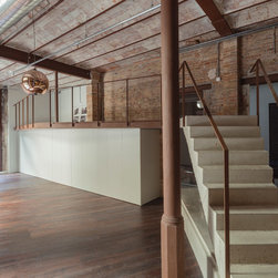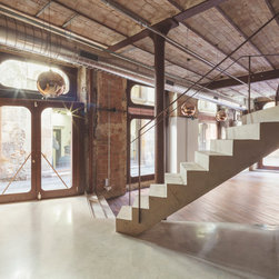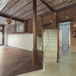 El proyecto también contempla el recorte de los altillos existentes en planta baja, los cuales fragmentaban mucho el espacio. Se mantiene una superficie de menor dimensión en la zona del showroom, con acceso desde una nueva escalera de hormigón armado con el mismo lenguaje constructivo que la escalera principal.