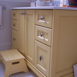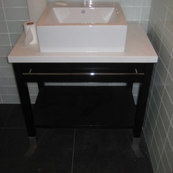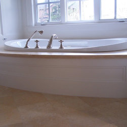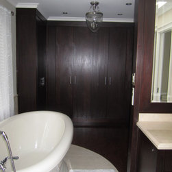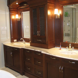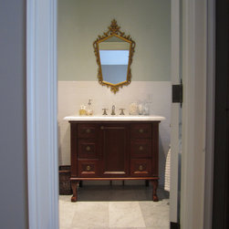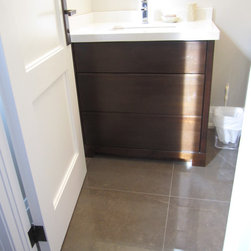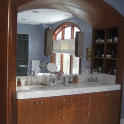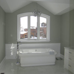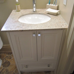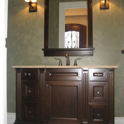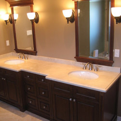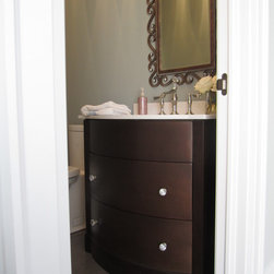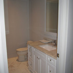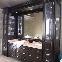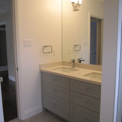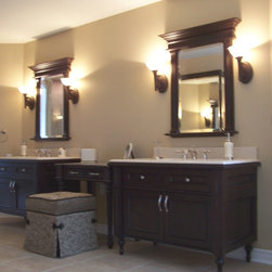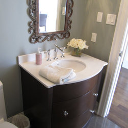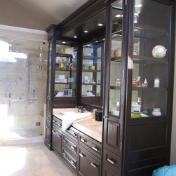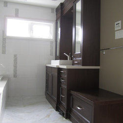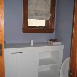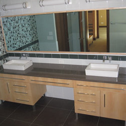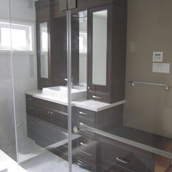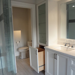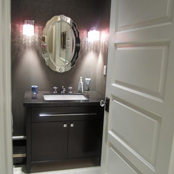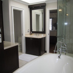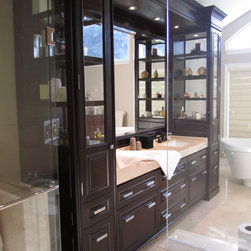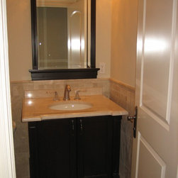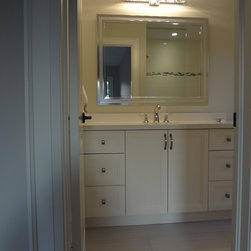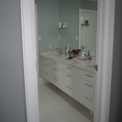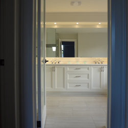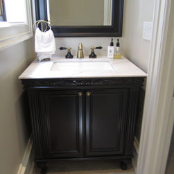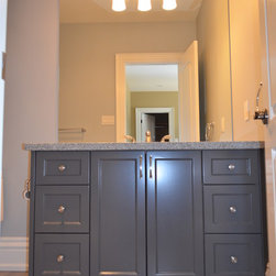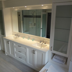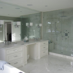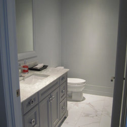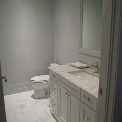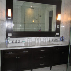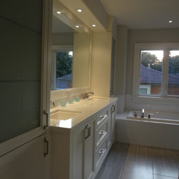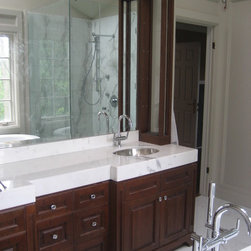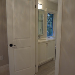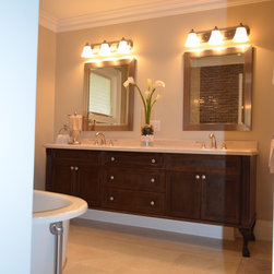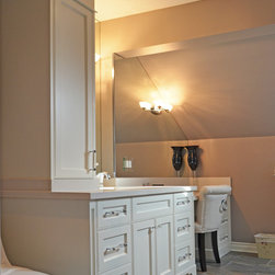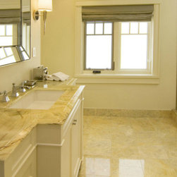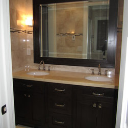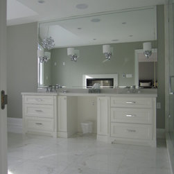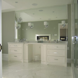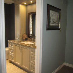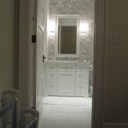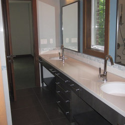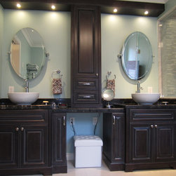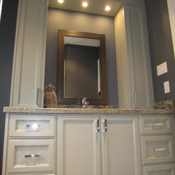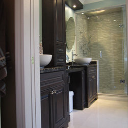 The design of this bathroom was meant to highlight the view of the lake that the window provides. The choice of an onxy counter top and soothing water colors with a touch of sparkle, left our clients guests never wanting to leave this inviting space.