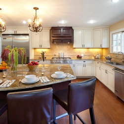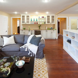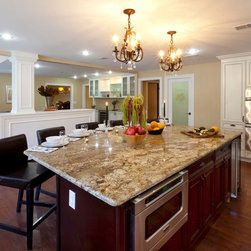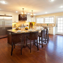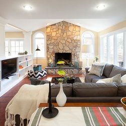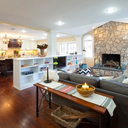The homeowners of this house wanted to maintain the open feeling of their space, but add a little more distinction between the different zones of the first floor. By adding a structural half wall with custom shelving, we combined design and function. A stone fireplace flanked by arched windows is the main focal point of the living room, where we custom-fit a TV into the shelving of the half wall. In the kitchen, a large island offers extra prep space as well as plenty of seating. French doors and tons of windows add natural light, and twin chandeliers add ambiance. Traditional lines define the custom cabinetry which houses all of the kitchen's appliances, and a pantry with a frosted glass provides extra storage.