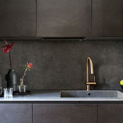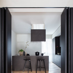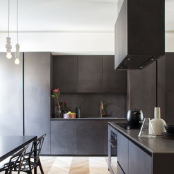 - l’ampia cucina (che, proprio grazie alle ante a libro, può diventare parte integrante della zona living). Da qui si ha anche accesso al locale lavanderia, alla camera-ufficio e a una porta blindata di servizio sul pianerottolo condominiale;
