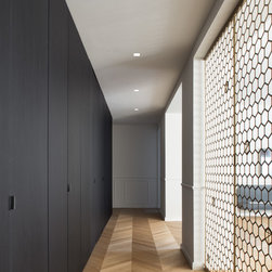 Un altro aspetto importante del progetto: la griglia su misura che funge da separè tra l’ingresso e la zona living. Color ottone, a maglia esagonale con il logo dello Studio Tenca inserito a intervalli irregolari a mo’ di firma, tale grata di design permette alla luce di filtrare e allo sguardo di non avere limiti, incontrando gli ambienti del salotto e della sala da pranzo.